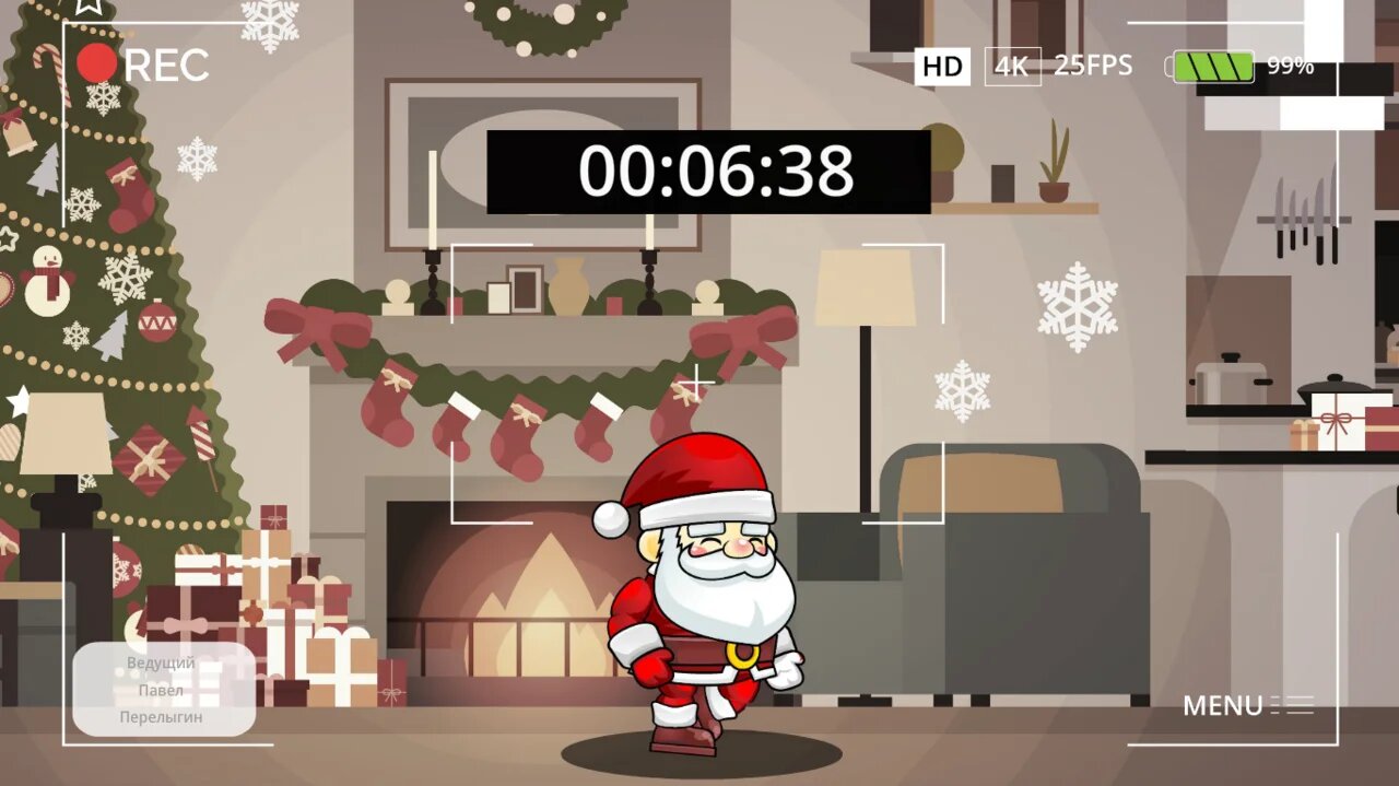 Далее он объясняет, что на экране будет обратный отсчет, по истечению которого, участник должен быстрее остальных достать телефон из кармана и сфотографировать бегущего Санту, которой