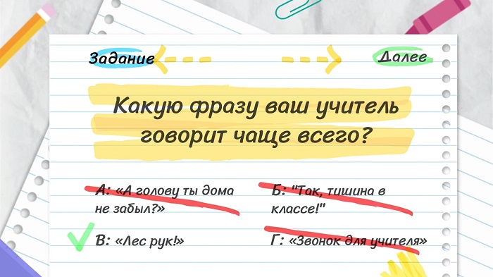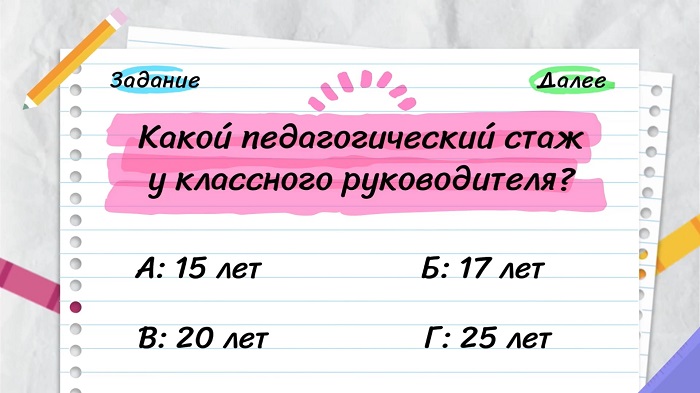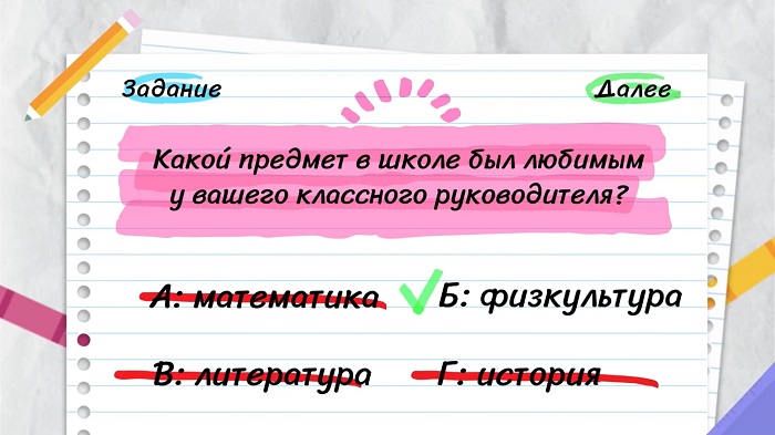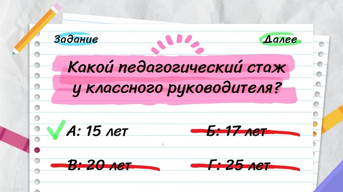 😎Задача выпускников - правильно ответить на вопросы про учителя, если они справляются с заданием, то получают 1 балл👍, если же они отвечают неверно, то им предстоит выполнить дополнительное задание-наказание🤪.