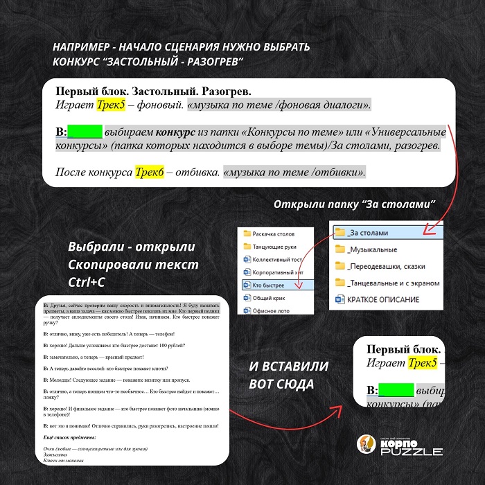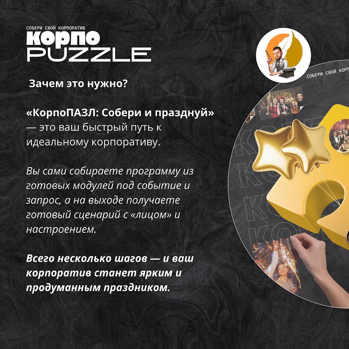 КорпоПАЗЛ — это сценарный конструктор, который экономит ваше время и превращает любое событие в яркое шоу без лишней головной боли.