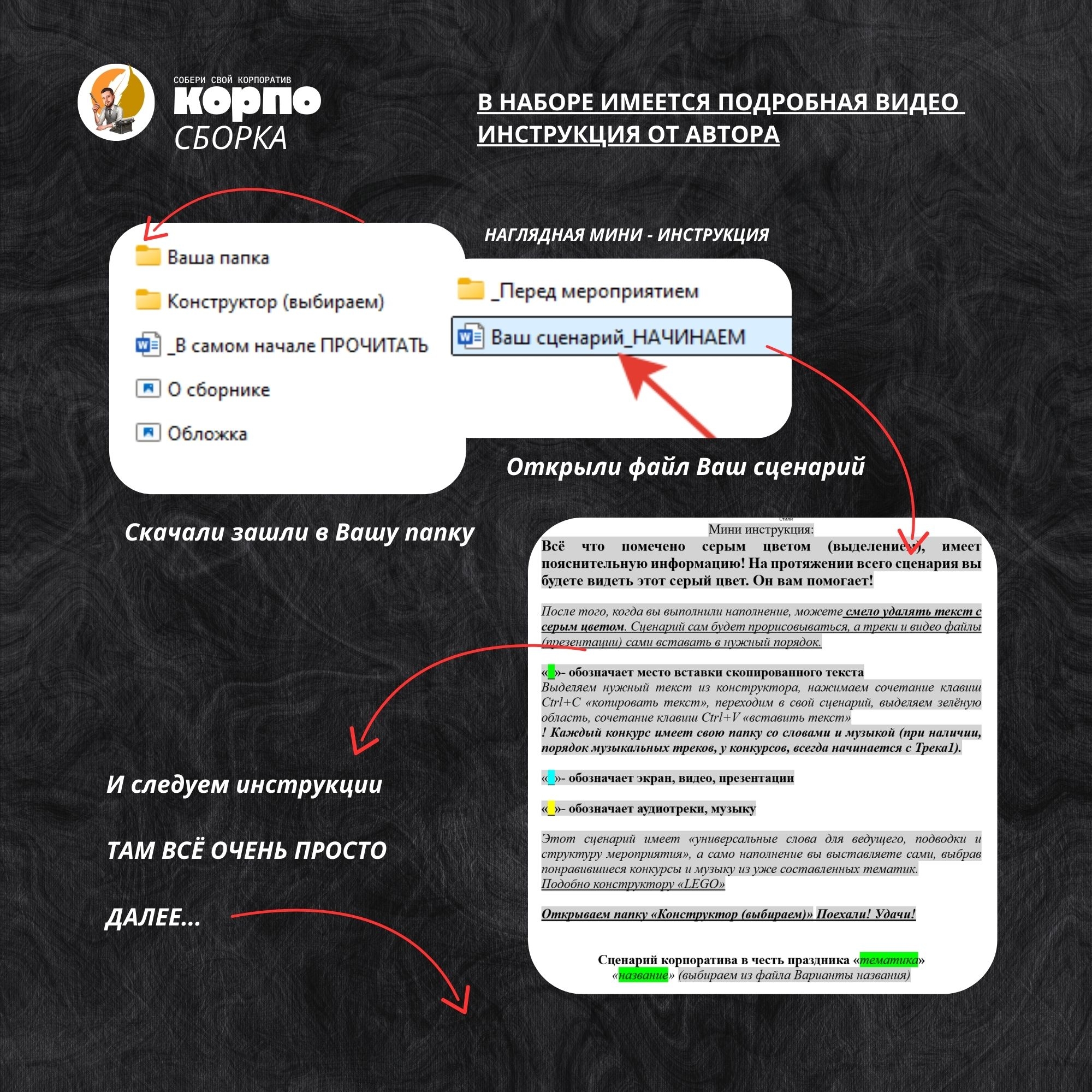 В итоге: у вас на руках полноценный сценарий — структурированный, живой и с гарантированным эффектом «ВАУ» для команды. В СОСТАВ СБОРНИКА ВХОДЯТ: