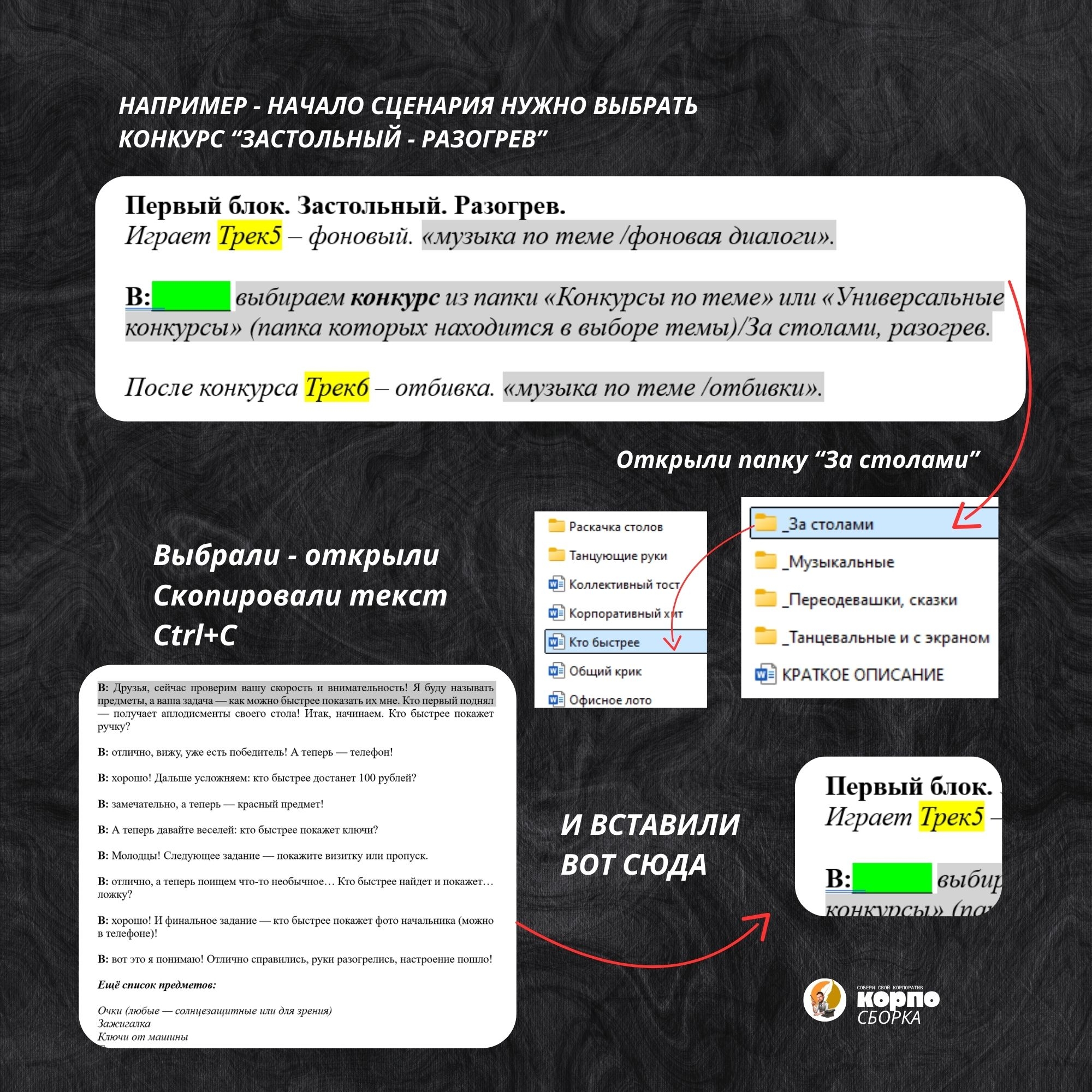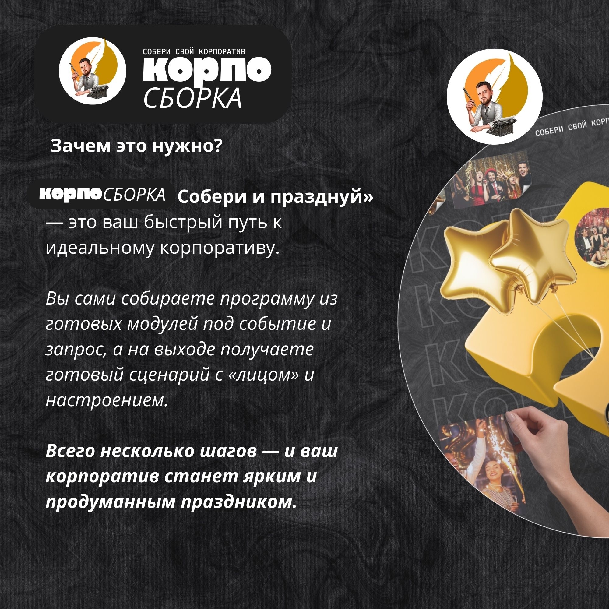 Хотите праздник, который собирается так же быстро, как пазл?Корпо-сборка — это готовый сценарный конструктор, созданный для тех, кто ценит время и хочет яркий результат без лишних хлопот.Внутри конструктора: