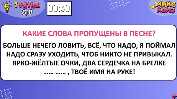 7 РАУНД «КВИЗИНО» - 8 вопросов, без вариантов ответа, 30 секунд на обсуждение, возможность ставить ставки на ответ.
