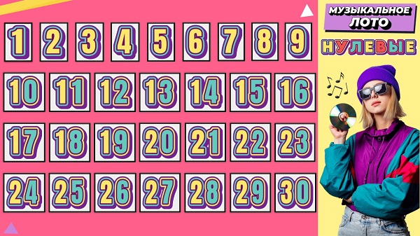 Для игры можно использовать 30 бочонков лото (гости достают бочонки) или команды по очереди называют числа. В комплекте -16 бланков для игры (для печати). Раздайте командам бланки и маркеры! С помощью бочонков будут выпадать числа – под которыми находятся песни. Команды, у которых есть в бланках данная песня встают и поют, а также зачеркивают эту песню в бланке!