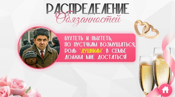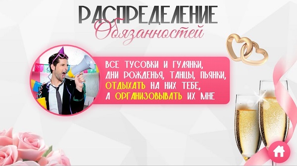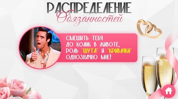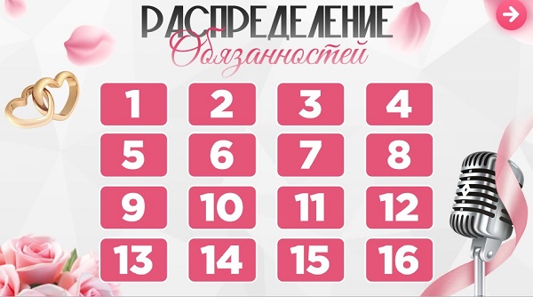 1. Гости видят на экране 16 ячеек, в каждой из которой спрятана обязанность, которую кто-то из молодоженов должен будет исполнять.