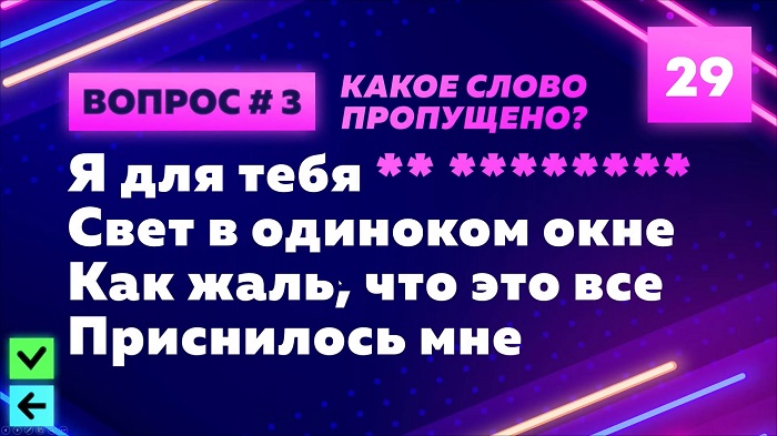 🤔 ЧЕГО-ТО НЕ ХВАТАЕТ: В известной песне пропущено ключевое слово. Задача гостей — восстановить пробел и блеснуть знанием текстов