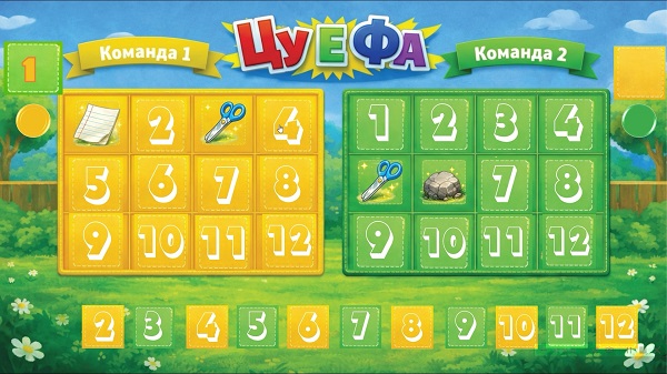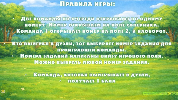 Две команды по очереди открывают по одному номеру на поле. Номер открываем на поле соперника. Команда 1 открывает номер на поле 2, и наоборот.