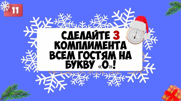 Участвуют две команды по 5 человек (каждый участник выполнит по два задания), команда мужчин и команда женщин! На экране 20 пронумерованных карточек. Участник команды (сначала М, потом Ж или наоборот) выбирает для себя номер карточки с заданием и старается выполнить его за 5 секунд. За выполненное задание команда получает 1 балл.